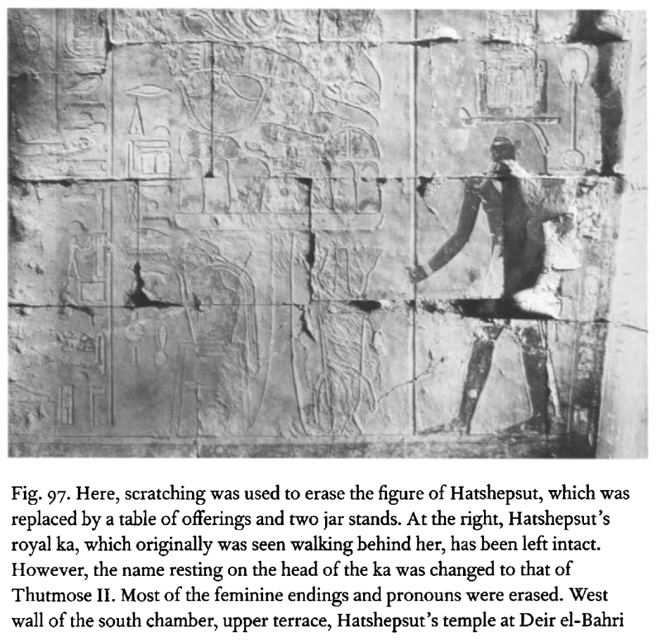 A robust and differentiated analysis of Hatshepsut’s reign must also examine the implicit subversion of patriarchal narratives. That is to say that, symbolically having a seemingly successful woman in a position of power does carry water. Hatshepsut’s mere existence might have been impactful for future generations of women seeking direction. This is a form of empowerment that could have spurred a bend in that fabled arc of justice. Yet Hatshepsut was unable to achieve this level of influence. The first reason for this is the systematic erasure that buried her very existence for centuries. The ramifications of which are virtually irrevocable. In his Proscription of Hatshepsut Peter Dorman remarks that “the systematic erasure of Hatshepsut’s name and figure from the kingly monument some years after her death has, inevitably, become a lens through which historians have viewed the events of her life and reign.” The erasure, largely carried out by Thutmose III, has systematically warped the narrative around Hatshepsut’s reign. Yet the outcome of this campaign was far more sinister than merely engendering harmless misconceptions; the erasure served to reassign credit away from Hatshepsut to other male kings. Figure 1.1 (see appendix) illustrates how the reassignment was carried out. In this instance, not only was a depiction of Hatshepsut removed but her inscription was replaced with that of Thutmose II. This campaign was only exacerbated by the fact that Hatshepsut was often depicted with masculine features making it simple to change the inscriptions and reassign credit.